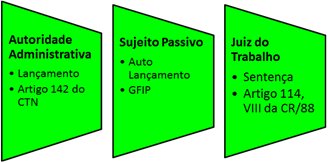 Portanto, desconsiderando a pretensa inconstitucionalidade do inciso VIII do artigo 114 da CR/88, temos que, no tocante à contribuição previdenciária patronal (artigo 195, I, “a” da CR/88), o Juiz do Trabalho se coloca ao lado da autoridade administrativa e do sujeito passivo como agente credenciado a realizar o lançamento tributário, conforme sintetiza o esquema abaixo: