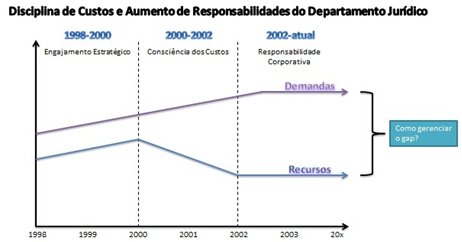 Ambos publicaram recente estudo intitulado “Law Department Strategy and Business Planning” no qual sugerem três fases na gestão do departamento jurídico das Companhias (BACCUS; SAPPER, 2012), que pode muito bem ser transportado para a realidade brasileira. Nesse estudo, demonstram uma evolução disciplinar no que tange aos recursos, que culminou numa contenção de gastos, em contraposição ao aumento das responsabilidades e das demandas, conforme se verifica no gráfico abaixo: