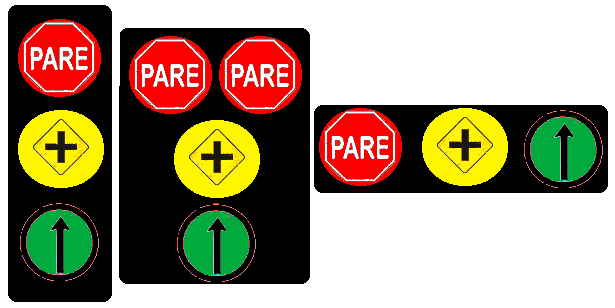 Este aperfeiçoamento da sinalização poderá ser executado através da sobreposição das figuras geométricas constantes do item 1.1.4 e 1.2.3 do anexo II do código de trânsito brasileiro 7 sobrepostas sobre os sinais luminosos. Assim, o vermelho seria sobrestado pelo sinal de "parada obrigatória", modelo R-1, que já possui, segundo o 1.1.1 do mesmo anexo, o encarnado ao fundo; sobre o verde seria utilizado os sinais de regulamentação compatíveis constantes do item 1.1.4 como, de acordo com a via, o "siga em frente" (R-26), o "vire a esquerda" (R-25a), o "vire a direita" (R-25b), o "siga em frente ou à esquerda" (R-25c), o "siga em frente ou à direita" (R-25d) ou o "sentido circular obrigatório" (R-33) e, por fim, o amarelo (facultativo) se serviria do conjunto dos sinais de advertência do item 1.2.3 do anexo II.