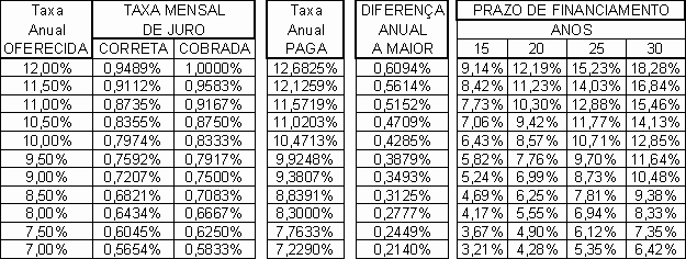 Portanto, num financiamento de 30 anos a uma taxa anual oferecida de 12% ao ano, o mutuário pagaria 18,28% a maior, a título de juro.