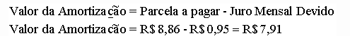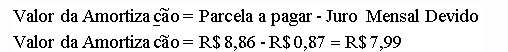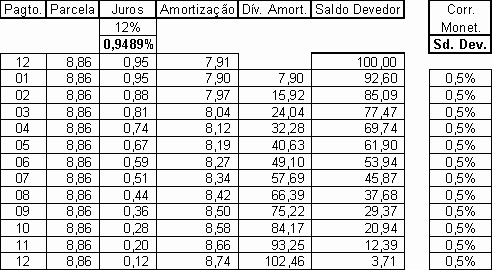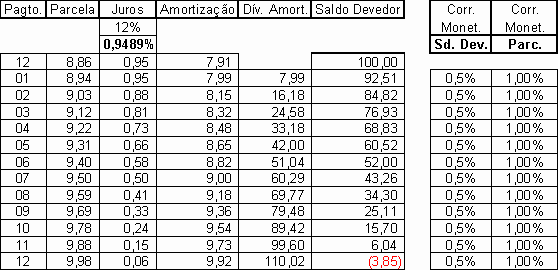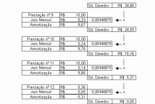 Para demonstrar a lógica do Sistema de Amortização Price, supomos que as parcelas a pagar de nºs 9, 10 e 11, fossem pagas a quantia de R$ 10,00 cada uma, ou seja, valor maior do que a parcela devida (R$ 8,86).