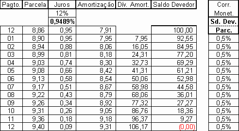 Notem que os pagamentos a maiores nas parcelas de nºs 9, 10 e 11, vão refletir na última parcela a pagar diminuindo-a de R$ 8,86 para R$ 5,36, no exemplo.
