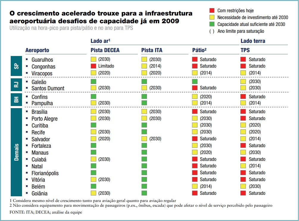 Ao analisar a movimentação de passageiros e a capacidade dos vinte principais aeroportos brasileiros em 2010 encontra-se um cenário preocupante. Dos vinte maiores aeroportos brasileiros (medidos pela movimentação de passageiros), quatorze operaram acima de 100% de sua capacidade, indicando uma situação crítica. Isso significou uma taxa média de ocupação para esses quatorze terminais de 187%. Outros três aeroportos apresentam-se em situação preocupante, operando acima de 80% das suas capacidades. Apenas três terminais encontram-se em situação adequada em termos de utilização de capacidade.247