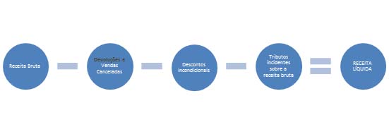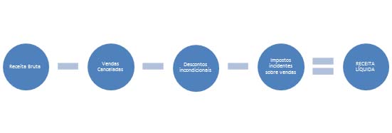 RECEITA BRUTA ( - ) Devoluções e vendas canceladas ( - ) Descontos concedidos incondicionalmente ( - ) Tributos sobre ela incidentes ( - ) Valores decorrentes do ajuste a valor presente das operações vinculadas à receita bruta = RECEITA LÍQUIDA |