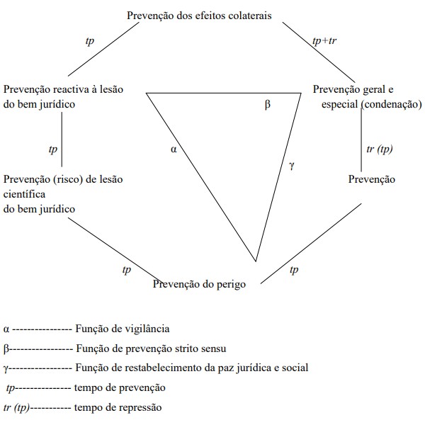 Insere-se na função de vigilância as ações de prevenção do perigo e prevenção de lesão (risco de lesão) do bem jurídico; na função de prevenção stricto sensu temos os atos de prevenção reativa à lesão do bem jurídico e prevenção dos efeitos negativos colaterais da lesão do bem jurídico; na função de restabelecimento da paz jurídica e social, age as medidas de prevenção geral e especial e a prevenção científica.