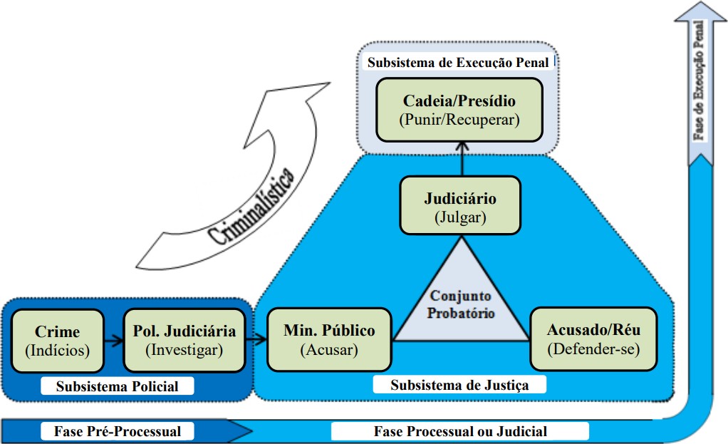 O Sistema de Justiça Criminal abrange órgãos dos Poderes Executivo e Judiciário em todos os níveis da Federação. O sistema se organiza em três frentes principais de atuação: segurança pública, justiça criminal e execução penal. Ou seja, abrange a atuação do poder público desde a prevenção das infrações penais até a aplicação de penas aos infratores. As três linhas de atuação relacionam-se estreitamente, de modo que a eficiência das atividades da Justiça comum, por exemplo, depende da atuação da polícia, que por sua vez também é chamada a agir quando se trata do encarceramento [...]. (FERREIRA & FONTOURA, 2008, p. 8).
