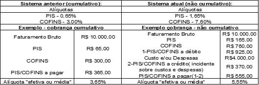 O quadro 1 acima apresenta o exemplo da forma de cálculo do PIS/PASEP e da COFINS, diferenciando a situação anterior (cumulativa) e a atual (não-cumulativa). Conforme demonstrado, o PIS/PASEP e a COFINS [4] são calculados “por dentro”, ou seja, o próprio tributo compõe a base de cálculo.