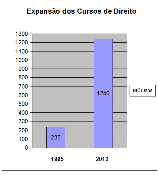 No Brasil, v. g. no ano de 1995, tínhamos 235 cursos de direito, sendo que, no ano de 2011 (dezesseis anos após), houve um aumento descontrolado de Instituições de Ensino que oferecem o curso de direito, passando para 1.240, em apenas dezesseis anos, ou seja, um aumento espantoso, absurdo, tanto que no mundo todo temos cerca de 1.100 cursos jurídicos e no Brasil existem mais cursos do que em todo o mundo.[1]