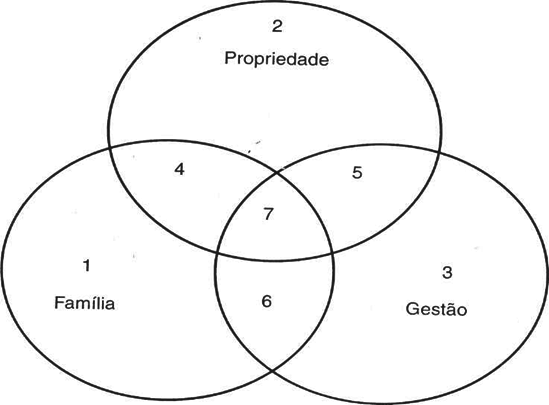 No estudo da empresa familiar, inicialmente identificaram-se duas esferas superpostas: a família e a gestão. Depois, incluiu-se também o subsistema da propriedade, surgindo, daí o atual modelo que cria o modelo de três círculos.