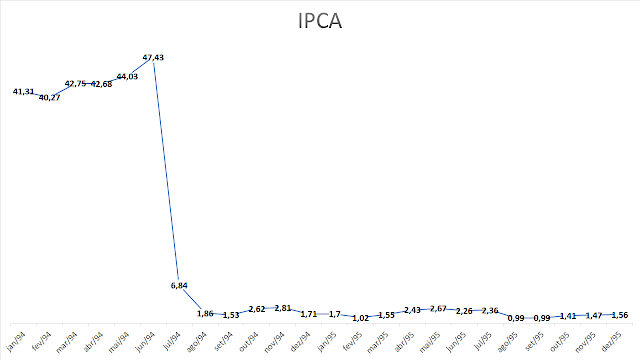 A de introdução da nova moeda - Em julho de 1994, foi possível criar, por decreto, uma nova unidade monetária estável, com queda rapidíssima dos índices inflacionários: o Cruzeiro Real saía de cena, a URV ficava congelada em sua última cotação de 31/06/1994 e dava lugar ao Real;
