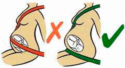 - a faixa diagonal deve cruzar o meio do ombro, passando entre as mamas e lateralmente ao abdome, nunca sobre o útero;