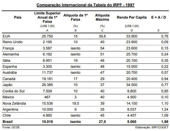 Um leitor menos atento pode achar que a alíquota máxima da Tabela I, de 45%, é excessiva. Não é. Já foi mostrado acima que os valores de alíquota máxima adotados nos países pertencentes à UE e à OCDE são superiores a este, aproximando-se de 50%, em média. Na Holanda, Bélgica e Japão chega a alcançar e até ultrapassar 60%15.