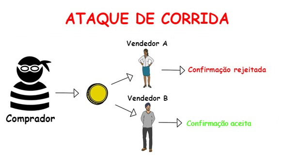 Um dos possíveis ataques de gasto duplo é chamado de "ataque de corrida", principalmente quando destinatários aceitam um pagamento de imediato, ou seja, com 0 confirmações, pagamento este que foi uma tentativa de gasto duplo em outra transação.