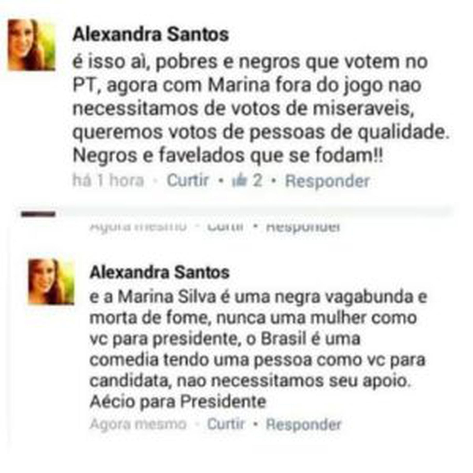 Este comentário, proveniente da rede social Facebook, é decorrente da candidatura de Marina Silva à Presidência, onde é feita uma comparação entre negros e vagabundos. Podemos observar, pelo comentário de Alexandra Santos, que em sua visão, uma mulher negra não poderia ser candidata à Presidência por não corresponder ao estereótipo de alguém que deveria representar e governar o brasileiro.