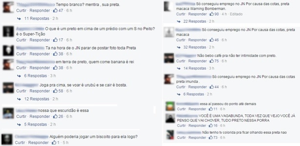 Também retirado da rede social Facebook, observamos que o racismo também atinge pessoas famosas, como é o caso da jornalista Maria Júlia Coutinho, que foi constantemente ofendida ao apresentar a previsão do tempo no Jornal Nacional. Observamos que, para muitos, negros não podem estar presentes nas redes de televisão como profissionais, visto que supostamente não estariam qualificados para tal, e se não fossem as cotas, provavelmente não estariam em tal cargo. Observa-se que a ofensa é em relação à cor da pessoa e não ao trabalho que executa.
