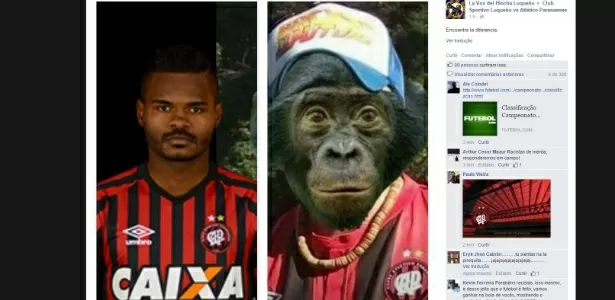 Tendo como fonte a rede social Facebook, neste post, um jogador de futebol é expressamente comparado com a figura de um macaco. Há vários casos nos estádios onde jogadores negros são comparados com macacos. Já ocorreu de alguns torcedores chegarem a jogar bananas no gramado, demonstrando todo o seu preconceito.
