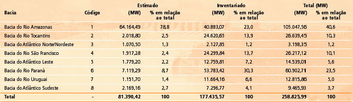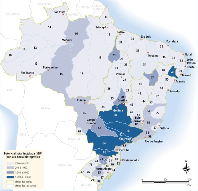 Pouco menos de 60% da capacidade hidrelétrica instalada no Brasil está na Bacia do Rio Paraná. Outras bacias importantes são a do São Francisco e a do Tocantins, com 16% e 12%, respectivamente, da capacidade instalada no País. As bacias com menor potência instalada são as do Atlântico Norte/Nordeste e Amazonas, que somam apenas 1,5% da capacidade instalada no Brasil.
