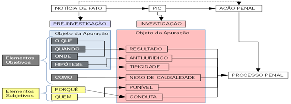 A construção desses paradigmas teóricos levou em consideração as dificuldades práticas enfrentadas no dia-a-dia da atividade e, também, a teoria do crime, pois quando se estuda o fato crime (conduta + nexo de causalidade + resultado + tipicidade + antijurídico + punibilidade) fica claro quais elementos precisam ser pesquisados, bastando no Procedimento de Notícia de Fato Criminal, diferentemente do PIC, encontrar elementos ao menos indiciários do resultado e da tipicidade. A conduta e o nexo de causalidade dependem do PIC, como finalidade de procedimento, apesar de não haver impedimento que todos esses elementos sejam eventualmente descobertos dentro ou fora desses procedimentos, conforme se vê abaixo: