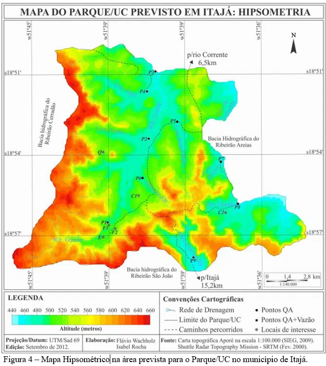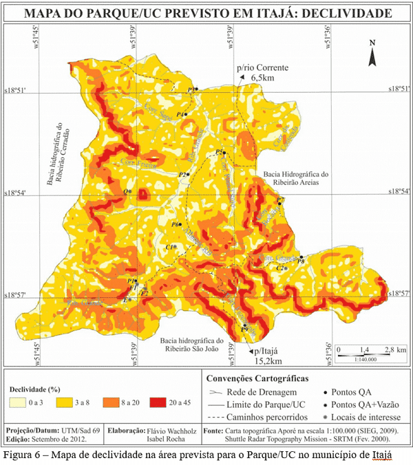 Sumário: 1. Introdução. 2. Caracterização da área destinada à Unidade de Conservação; 3. Objetivos da pesquisa na Fazenda São Miguel em Itajá-GO, 3.1. Aspectos climáticos, 3.2. Hidrografia, 3.3. Hipsometria, 3.4. Declividade, 3.5. Uso e Ocupação das Terras; 4. Principais problemas ambientais na área em estudo; Referências.