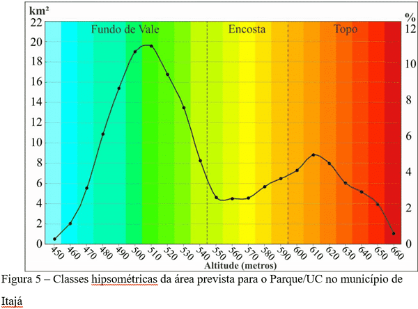As cotas entre 600 a 660 metros somando-se as classes de altimetria registraram 22,71% de área, e são as áreas de cotas mais elevadas, consistindo no topo dos morros.