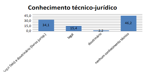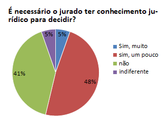 Para a maioria dos jurados (53%), é necessário algum tipo de conhecimento técnico do direito. Na verdade, a percentagem equivale aos juízes leigos que afirmam possuir algum tipo de conhecimento legal/doutrinário. Aparentemente, a julgar pela natureza humana, o jurado acha importante aquilo que possui, enquanto desconsidera aquilo que não tem. Isso, entretanto, de maneira alguma, os faz pensar que são inaptos a julgar.