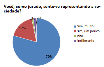 Com essa explanação inicial aos jurados, busquei deixá-los à vontade para responder, visto a desconfiança natural – mesmo informados tratar-se de uma pesquisa acadêmica de mestrado – derivada de uma pesquisa com o juiz leigo, realizada por um advogado3, sobre seu perfil e opiniões acerca do júri, as partes e o julgamento. Afirmo, entretanto, a partir das respostas colhidas e compiladas, que o resultado foi positivo, com baixo índice de questões em branco/rasuradas.