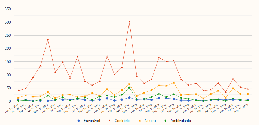 Em seu pico negativo, as estastíticas marcaram quase 300 matérias de valências consideradas contrárias no período de abril de 2018. Foi nesse período que Lula teve sua prisão decretada e executada. Assim, pela lógica universal, seria um fato natural essas exposições negativas visto que o ex-presidente foi preso, entretanto, a própria metodologia utilizada busca analisar não apenas a notícia em questão, como também sua relação com as manchetes, chamadas e imagens, ou seja, todo o conjunto de elementos comunicativos são levados em consideração no momento da classificação.