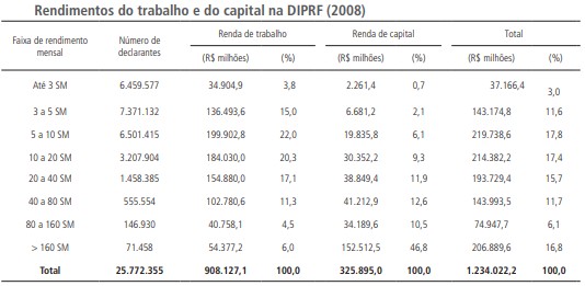 Elucidando tal fato, veja-se tabela de autoria de Rodrigo Cardoso Fernandes, Bernardo Campolina e Fernando Gaiger Silveira, que utilizando-se de dados referentes a DIRPF do ano de 2008, demonstra a disparidade na tributação das rendas do trabalho e das rendas oriundas do capital:26