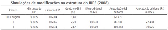 Rodrigo Cardoso Fernandes, Bernardo Campolina e Fernando Gaiger Silveira, buscando demonstrar os efeitos de tamanha distorção que tal modelo hoje imposto acarreta no nosso país, estudaram alguns cenários que, simulando tão somente a retomada da tributação sobre lucros e dividendos, em dois contextos: i) com manutenção da alíquota de tributação existente até 1995, sendo linear no valor de 15% e ii) observando-se a progressividade de alíquotas na faixa de 15% a 27,5%, demonstram a diminuição do índice GINI com base em declarações de IRPF do ano de 200828.