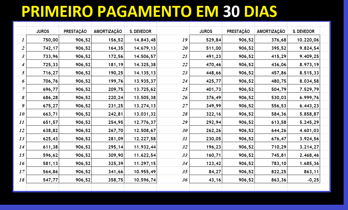 Observe abaixo o demonstrativo de evolução do saldo devedor tradicional, também chamado de quadro de amortização. Nele, a capitalização de juros não é aparente, em virtude do modo (padrão) como ele é construído. Inicialmente, a fim de facilitar a monitoração do comportamento das quatro variáveis ao longo do prazo, consideremos, em nosso exemplo, que todos os pagamentos possuam a periodicidade mensal.