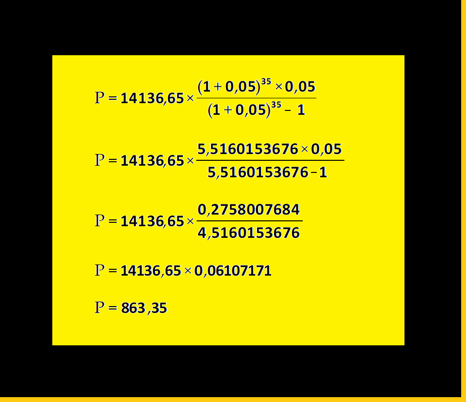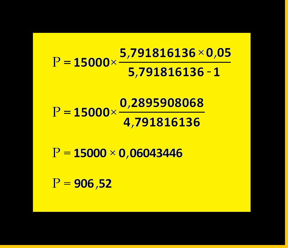 Na equação acima é possível notar a expressão: "(1+0,05) elevada à potência 36". Isso é o mesmo que multiplicarmos várias vezes a expressão "(1+0,05)" por ela mesma. Essa expressão aparece no numerador e também no denominador da equação e representa o Fator acumulado de capitalização, resultante do prazo de 36 períodos. Efetuando o cálculo desse fator citado, encontramos como resultado 5,791816136. A partir desse momento, a obtenção do resultado do valor das iguais prestações pela Tabela Price já está bem mais próxima, visto que, como já dito, o fator mencionado aparece no numerador e no denominador da equação, bastando, então, realizar a substituição na mesma. Observe abaixo como ficou mais confortável o trabalho de resolução da equação: