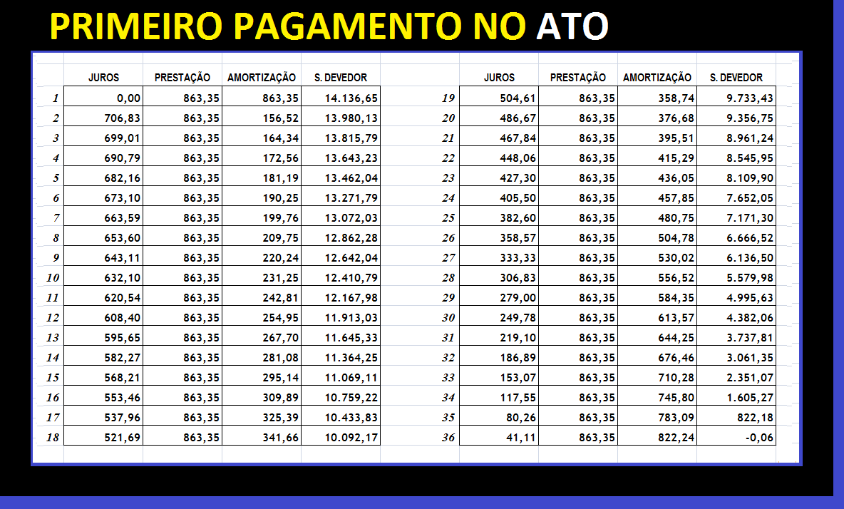 Observe abaixo o demonstrativo de evolução do saldo devedor tradicional. Por meio dele, note que o saldo devedor, como explicado acima, se torna R$ 14.136,65 após o primeiro pagamento, restando, por essa razão, as realizações dos pagamentos de número 2 ao 36. O valor inicial contratual foi de R$ 15.000,00, entretanto, como é possível notar detalhadamente no demonstrativo, o valor financiado, de fato, foi de R$ 14.136,65. Do pagamento de número 2 ao 36 existem 35 pagamentos (quantidade de parcelas introduzida na equação acima). Ressaltando que, nesse exemplo de financiamento com pagamentos antecipados em um período, obviamente e sem dúvida alguma, com exceção da entrada (primeira prestação sem juros) e também da segunda prestação (com vencimento após somente um período de capitalização), todas as demais parcelas até a última possuiriam juros sobre juros em seu interior.