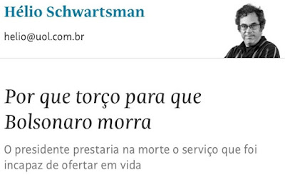 Hélio Schwartsman fez um artigo demonstrando a monstruosidade implícita nesse posicionamento de Jair Bolsonaro de uma forma inusitada: provou que, se ele morrer de Covid-19, o ganho quantitativo de vidas será imenso, já que seu negacionismo, disseminando a confusão e servindo como exemplo que cidadãos ignorantes e influenciáveis imitam, é causa de óbitos por atacado.