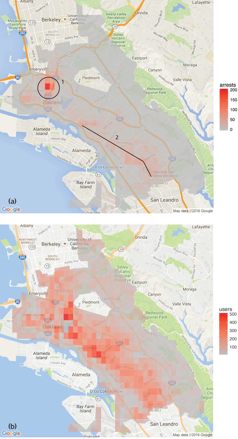 Ademais, a Imagem 1 – (a), as zonas quentes se situam entre bairros nos arredores de West Oakland e International Boulevard (pontos 1 e 2). Não por acaso, essas regiões possuem uma população predominantemente negra, latina e de baixa renda, bairros que “experimentam cerca de 200 vezes mais prisões relacionadas a drogas do que outras áreas”.