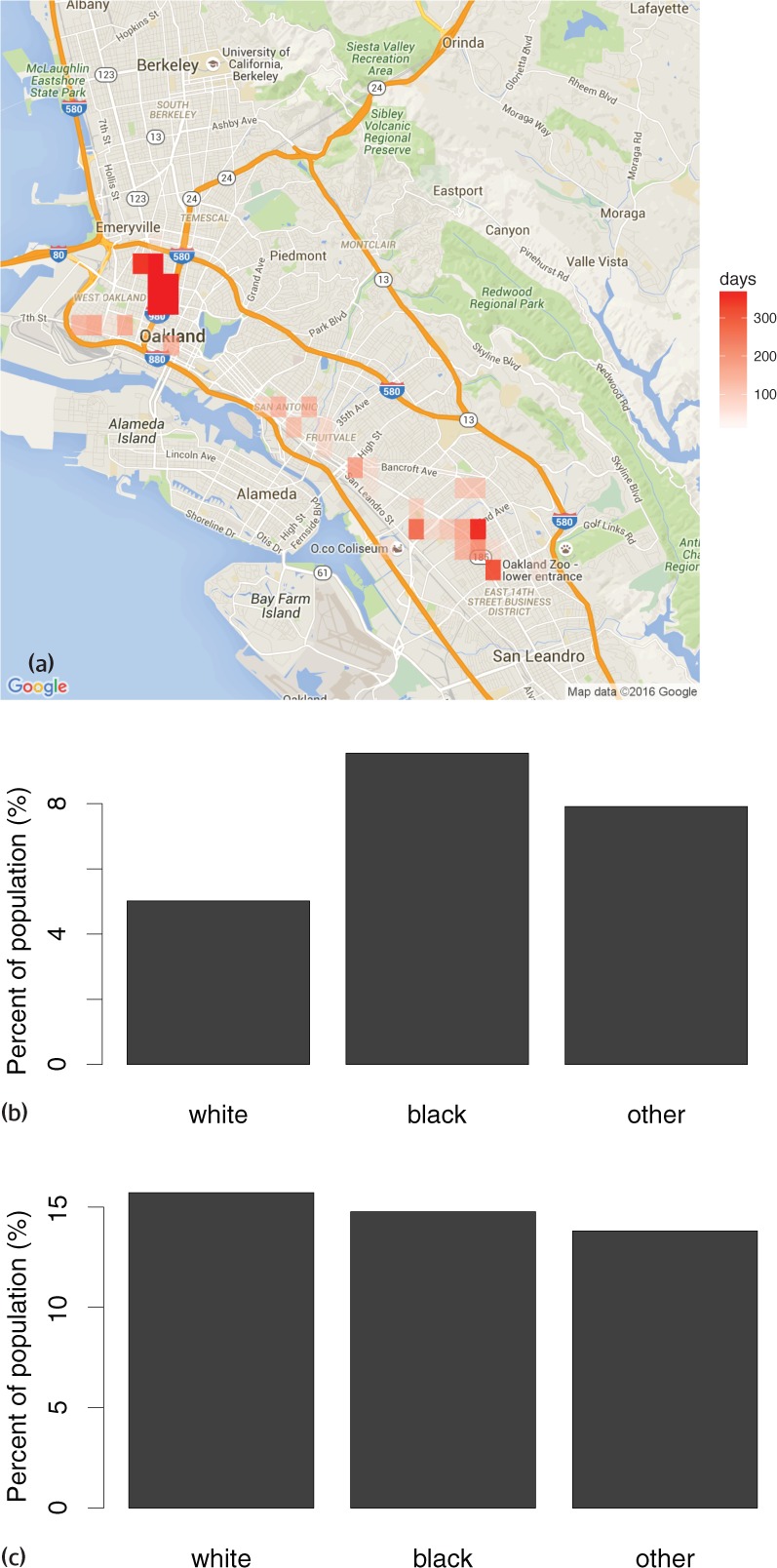 A imagem 2 – (b) aponta que, se o PredPol fosse usado em Oakland, as pessoas negras teriam duas vezes mais chances de serem alvos do policiamento preditivo do que pessoas brancas. Em contraste a isso, a imagem 2 – (c) aponta que o uso de drogas é praticamente o mesmo entre as classificações raciais.[25]