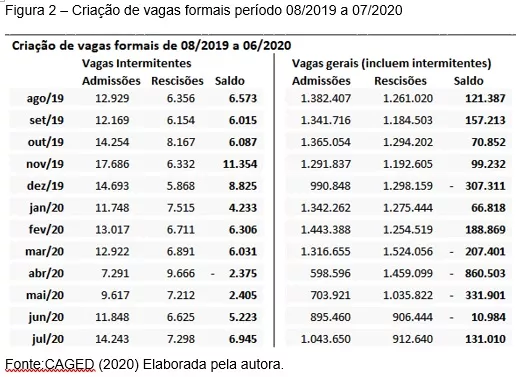 Analisando os dados de agosto de 2019 a junho de 2020 (Figura 2) observa-se que o saldo de vagas gerais está negativo em 1.013.729 vagas, enquanto as vagas exclusivamente intermitentes apresentam um saldo positivo de 60.677 vagas. Percebe-se ainda que houve um aumento do saldo das vagas relativas aos contratos intermitentes, reduzindo-se mais expressivamente no mês de março e abril/2020, em função das medidas restritivas adotadas a fim diminuir a propagação da pandemia (COVID-19).