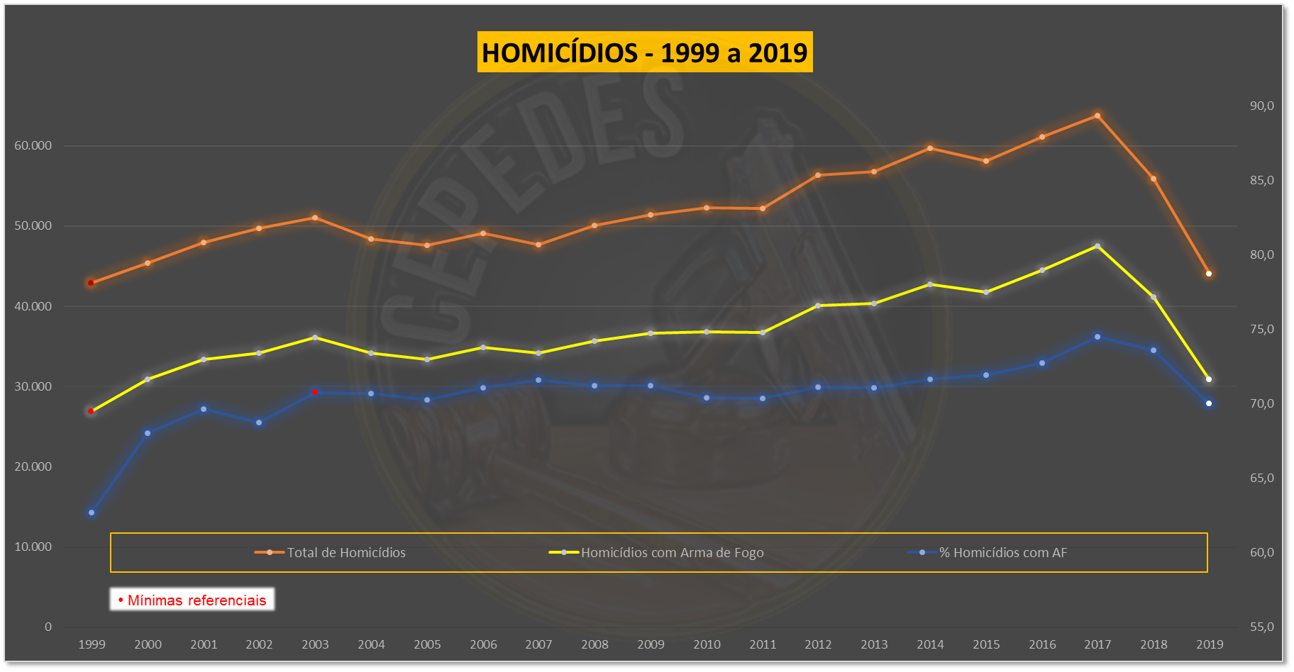 Em setembro de 2020, o DATASUS divulgou os dados preliminares de homicídios para o ano de 2019, revelando uma queda recorde nesses crimes (22,99%), bem assim o menor número absoluto de agressões letais com arma de fogo desde 1999 (30.205). Os dados foram analisados em publicação do CEPEDES, identificando-os claramente como preliminares e explicando a metodologia que justificava sua utilização, centrada no fato de que variam muito pouco em relação aos dados definitivos - historicamente, menos de 3%.