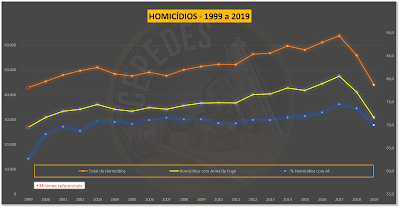 Oficialmente, foram registrados no Brasil, em 2019, 43.033 homicídios. É o menor número desde 1999, quando o cômputo ficou em 42.914. Em relação a 2018, quando o total ficou em 55.914, a queda percentual definitiva foi de 21,25%. É a maior variação negativa de toda a série histórica, apurada desde 1980 - há quarenta anos, portanto.