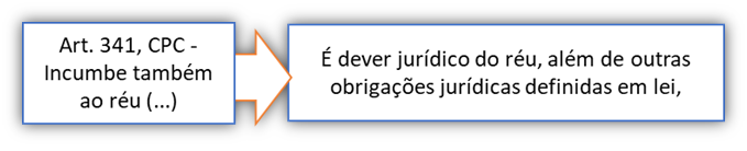 Assim, por meio de uma análise sistemática, é possível compreender que o legislador, ao redigir o artigo 341 do CPC, pretendeu positivar que: “É dever jurídico do réu, sem prejuízo de outras obrigações legais (...)" , conforme segue: