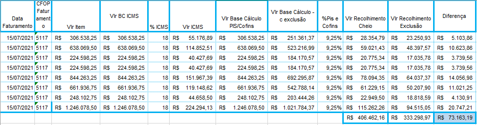 Constata-se que a exclusão do ICMS da apuração das contribuições na mesma competência de registro do faturamento reduz o valor final da tributação em R$73.163.19.