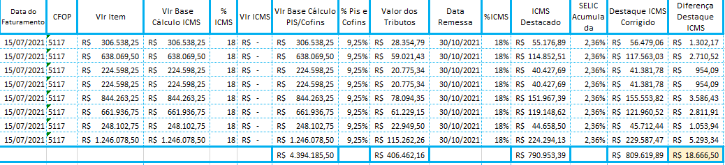 Assim, foram considerados faturamentos para a competência 07/2021 e remessa das mercadorias na competência de 10/2021.