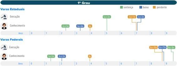 Conforme aponta o gráfico, as maiores faixas de duração estão concentradas no tempo do processo pendente e, conforme o relatório, na fase de execução da Justiça Federal (8 anos e 7 meses) e da Justiça Estadual (6 anos e 11 meses).