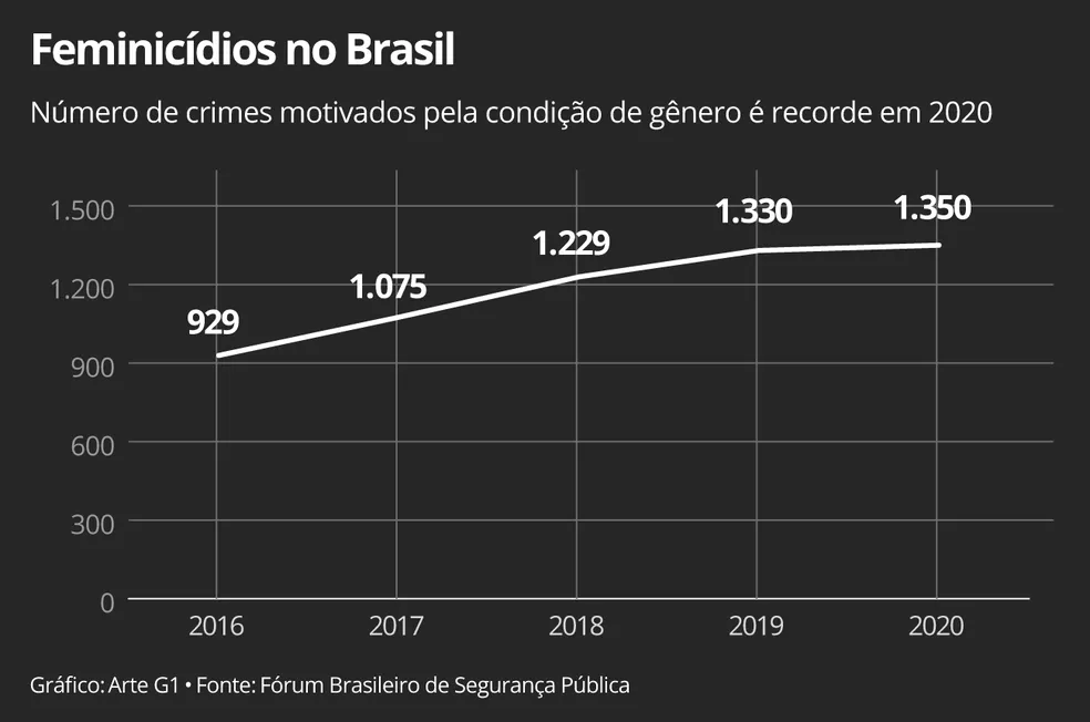 Conforme uma pesquisa realizada pelo site G1, em 2020 houve um crescimento nos casos de feminicídio, em comparação aos outros anos apurados por meio de pesquisa, assim como apresenta a imagem 01. Os números apresentados não decorrem de um índice exato, uma vez que muitas ocorrências de feminicídio não são apuradas.