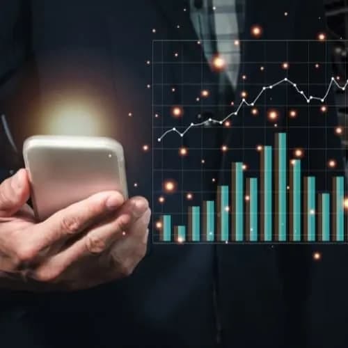 Figura 1: Homem olhando celular e símbolo de gráfico.