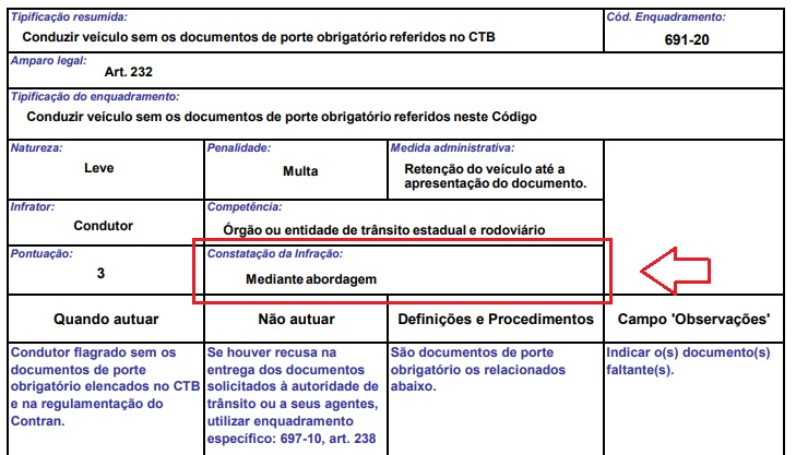 Um segundo exemplo, agora das poucas infrações que obrigam a abordagem, é a infração por dirigir sem os documentos de porte obrigatório, prevista no artigo 232 do CTB. Essa infração só pode ser verificada com a abordagem do veículo, para que se verifique de fato que o condutor não está com os documentos obrigatórios consigo.