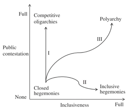 Considerando a imagem, para um país ser considerado uma poliarquia, ele precisa ser, simultaneamente, inclusive e aberto à contestação pública. Não é possível ser considerado democrático se em um país as pessoas têm direito a voto, mas não podem contestar o governante. É importante destacar que as duas dimensões podem variar de maneira independente. Além disso, na elaboração de Dahl, a poliarquia surge como função dos custos de repressão excedendo os custos de tolerância política das facções distintas/opositoras da sociedade. Nesse sentido, a democracia liberal, a qual o conceito de poliarquia se filia, é uma questão de respeito e tolerância ao pluralismo, uma preocupação presente desde os liberais ingleses.