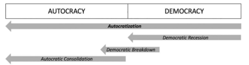 Dessa forma, as principais conceituações de regimes políticos e indicadores que mensuram a qualidade de democracias ao redor do globo adotam a autocracia como o oposto de democracia, principalmente se entendermos que ao esvaziarmos os eixos de contestação e de participação descrevemos um regime autocrático. Um dos primeiros indicadores quantitativos a medir qualidade da democracia com ampla difusão entre pesquisadores de todo mundo, o indicador polity é construído a partir de dois indicadores primários, em que um se propõe a medir o grau de institucionalização de normas democráticas em um país, e o outro o nível de autocratização, entendido como um regime com poucos constrangimentos ao poder do chefe do executivo e sem competição justa para acessar esse cargo (Marshall, Gurr, 2020). Já um dos indicadores mais utilizados na contemporaneidade para identificar um retrocesso global da democracia, o indicador de democracia eleitoral do V-Dem (Coppedge et al., 2021), considera que em um mesmo contínuo os valores variam desde 1, marcada pelo conceito de democracia liberal, para 0, autocracia fechada. A Figura 2, retirada de Luhrmann e Lindberg (2019), ilustra o conceito do indicador contínuo, com destaque para os conceitos de autocratização (qualquer movimento de diminuição do indicador), oposto a democratização; recessão democrática (diminuição das qualidades democráticas de um regime que se mantém democrático); ruptura democrática (a transformação de um regime democrático para um regime autoritário); e consolidação autoritária (ampliação das características autoritárias de uma autocracia).