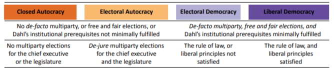 Outro exemplo de tipologia de regimes políticas que concentra as atenções para as instituições é a Regimes of the World (Luhrmann, Lindberg, 2018). Essa categorização compreende que democracia e autocracia são polos distintos e opostos de regimes políticos, mas abre espaço para subcategorias que apresentem características mistas. A Figura 2 ilustra a conceitualização do Regimes of the World, dividindo os regimes do mundo entre Autocracia Fechada, Autocracia Eleitoral, Democracia Eleitoral e Democracia Liberal. Atentemos para as subcategorias do meio, autocracia eleitoral e democracia eleitoral. O que as diferenciam?