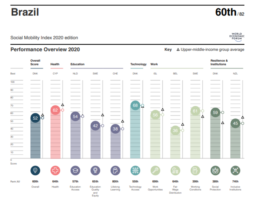 O Brasil ocupa a 57ª posição em acesso geral à educação; a 64ª posição em acesso à saúde; a 65ª posição no acesso à educação de qualidade e na igualdade de acesso; a 69ª posição em acesso à oportunidade de trabalho; a 74ª posição em instituições inclusivas; a 64ª posição em distribuição justa de salários; e a 80ª posição em aprendizagem ao longo da vida.