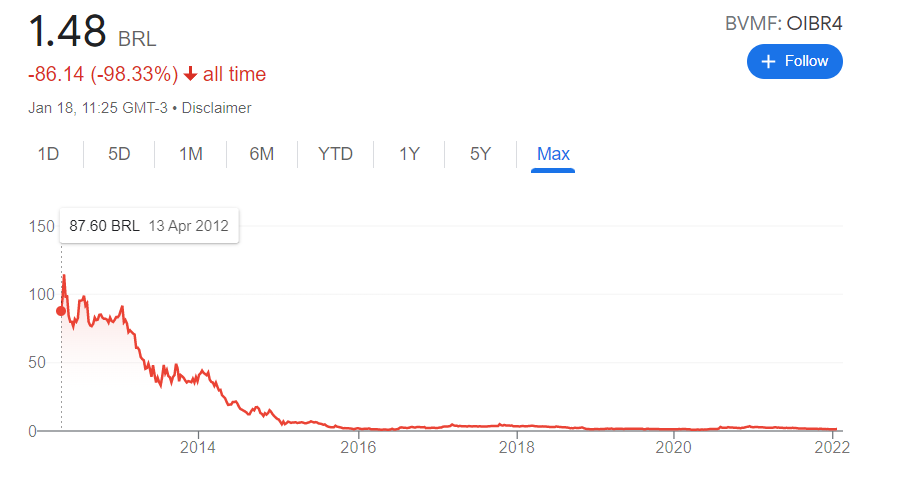 Porém a conclusão do inventário demandou 10 anos e só ocorreu em 2022, período no qual a empresa Oi deixou de ser uma das mais robustas do mercado e entrou em recuperação judicial. Resultado, a cotação da OIBR4 despencou para R$ 1,48, conforme o gráfico abaixo.